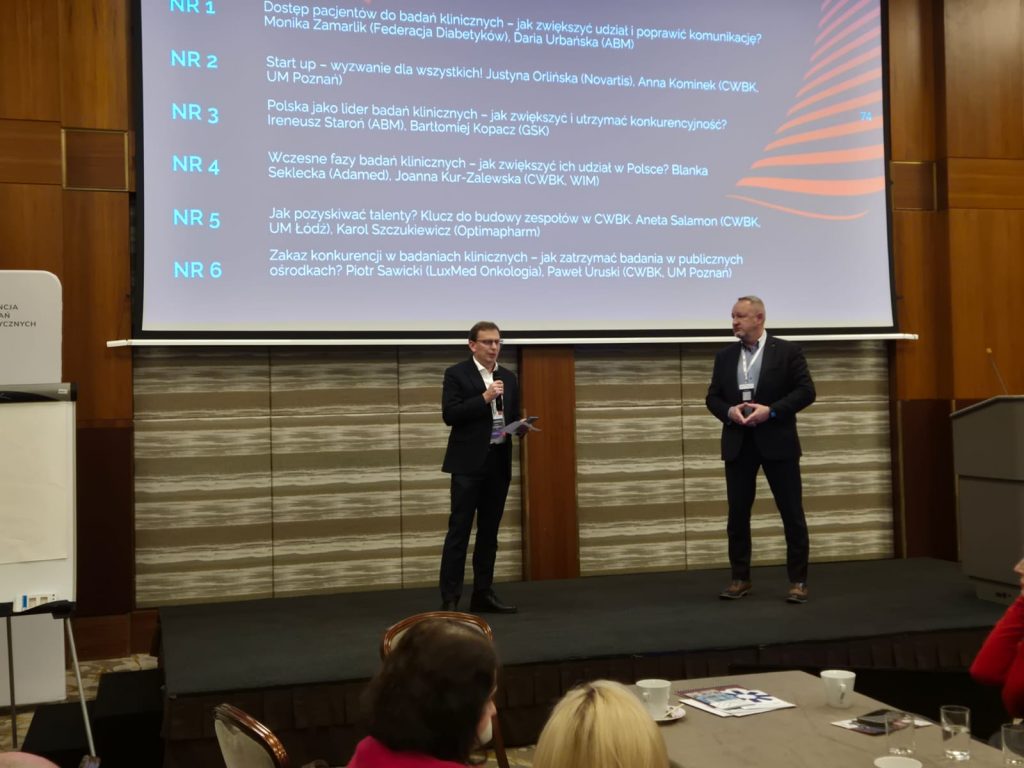 Spotkanie było świetną okazją do nawiązania kontaktów i budowania trwałych relacji, bo one też warunkują dobrą współpracę! Przekonali się o tym dr n.med. Paweł Uruski – Zastępca Dyrektora naszego poznańskiego UCWBK i dr n. med. Dawid Lipski – Kierownik Ośrodka Badań Klinicznych Wczesnych Faz, którzy również uczestniczyli w spotkaniu, a Paweł moderował dyskusję o tym, jak zatrzymać badania w ośrodkach publicznych.